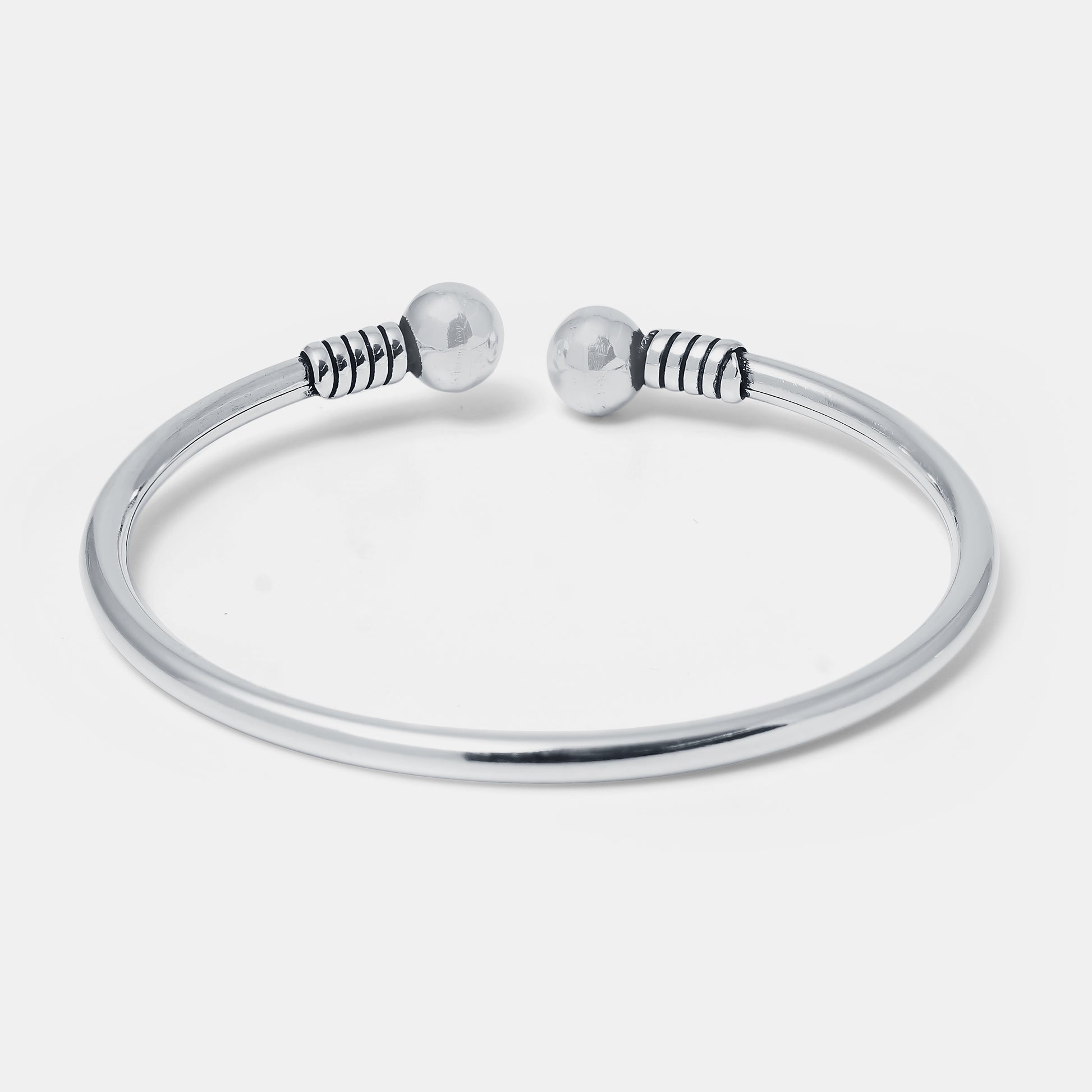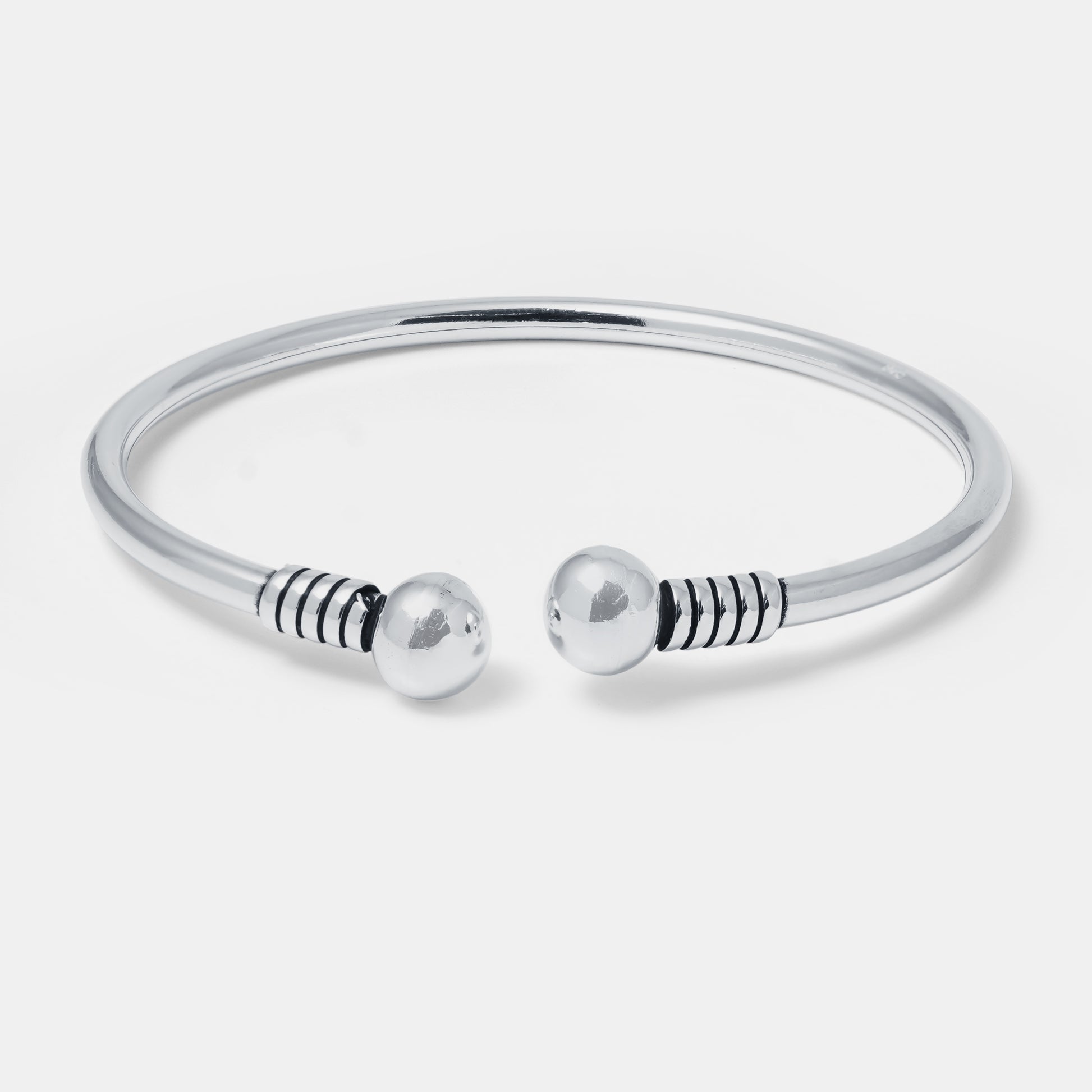 Carved into the excellence of luxe 925 Silver - featuring a lightweight hollowpipe design achieved through advanced electroforming. The bangle boasts a brilliant high polish finish and is adorned with two polished silver spheres and oxidised ring accents for a refined, contemporary look.
